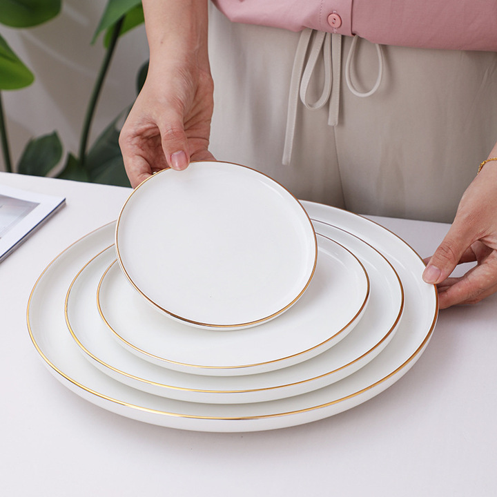 Pratos de jantar em massa baratos para restaurantes por atacado, talheres brancos, pratos de cerâmica com borda dourada